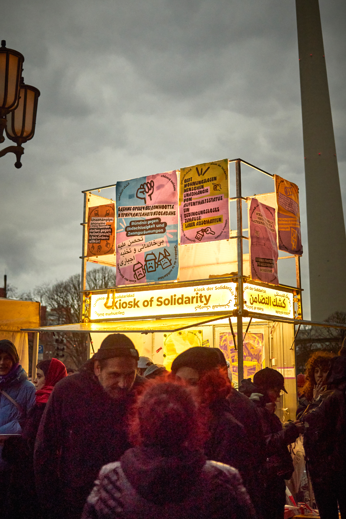 Der Kiosk der Solidarität ist ein urbanes Praxis-Format, das in die umkämpften gesellschaftlichen Felder Arbeit, Gesundheit und Wohnen in Berlin interveniert. Über 25 solidarische Berliner Initiativen und Projekte haben den Kiosk seit 2023 an unterschiedlichen Orten Berlins jeweils für einige Tage genutzt. In vielfältigen Formaten bringen sie Nachbar*innen, Mitstreitende und andere Interessierte zusammen und tragen ihre solidarische Praxis temporär in den öffentlichen Stadtraum. Der Kiosk erzeugt für marginalisierte Gruppen (z.B. migrantische, geflüchtete, queere Communities oder wohnungslose Menschen) Sichtbarkeit und vernetzt diese mit anderen Initiativen. Das Kiosk-Projektteam unterstützt, zusammen mit Studierenden der TU Berlin, die Initiativen bei der Realisierung ihrer Nutzungsideen für den Kiosk: bei der Gestaltung der Poster, der Beantragung der Standgenehmigungen, der Logistik, der Dokumentation und der Finanzierung.