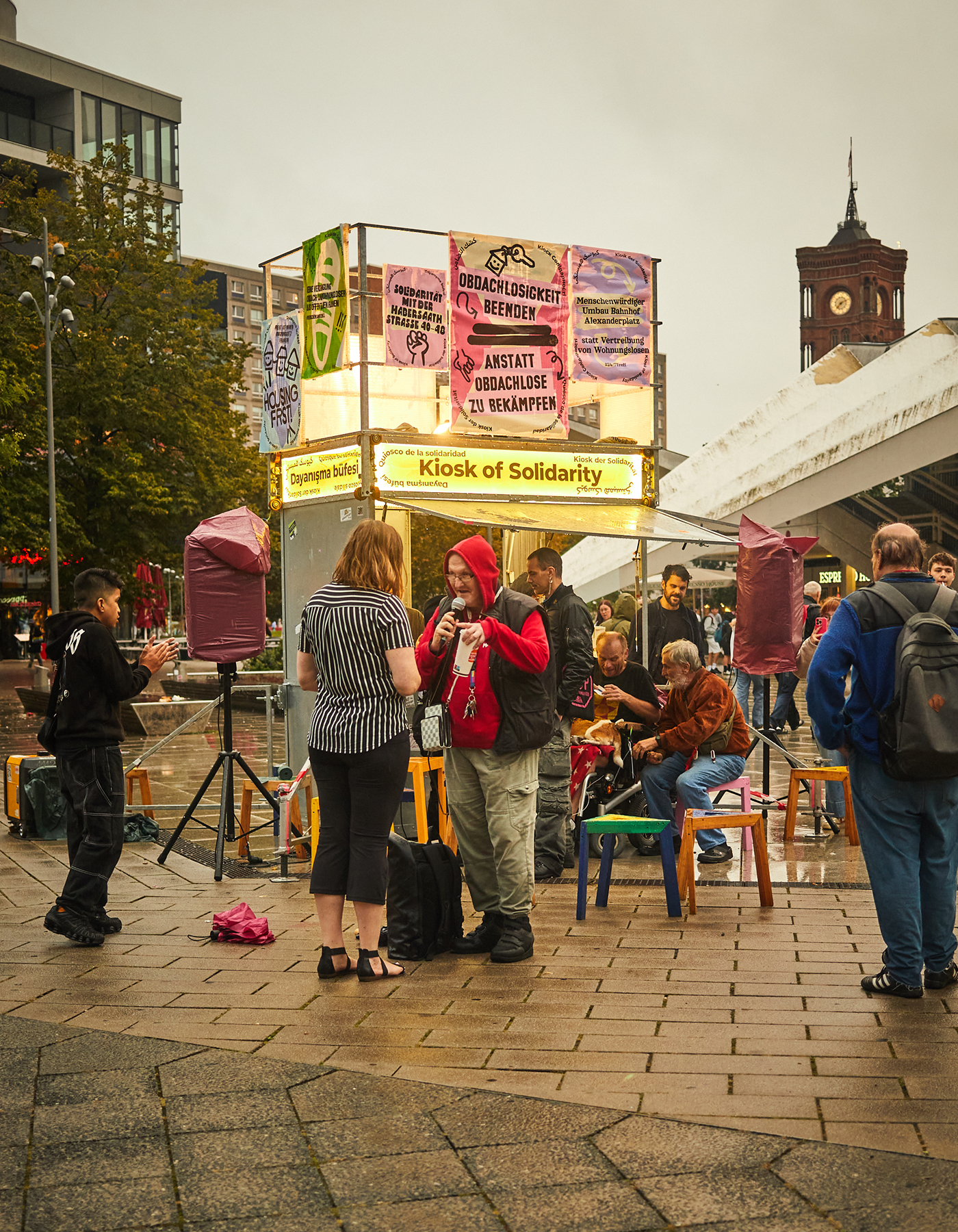Der Kiosk der Solidarität ist ein urbanes Praxis-Format, das in die umkämpften gesellschaftlichen Felder Arbeit, Gesundheit und Wohnen in Berlin interveniert. Über 25 solidarische Berliner Initiativen und Projekte haben den Kiosk seit Juni 2023 an unterschiedlichen Orten Berlins jeweils für einige Tage genutzt. In vielfältigen Formaten bringen sie Nachbar*innen, Mitstreitende und andere Interessierte zusammen und tragen ihre solidarische Praxis temporär in den öffentlichen Stadtraum. Der Kiosk erzeugt für  marginalisierte Gruppen (z.B. migrantische, geflüchtete, queere Communities oder wohnungslose Menschen) Sichtbarkeit und vernetzt diese mit anderen Initiativen. Das Kiosk-Projektteam unterstützt, zusammen mit Studierenden der TU Berlin, die Initiativen bei der Realisierung ihrer Nutzungsideen für den Kiosk: bei der Gestaltung der Poster, der Beantragung der Standgenehmigungen, der Logistik, der Dokumentation und der Finanzierung.