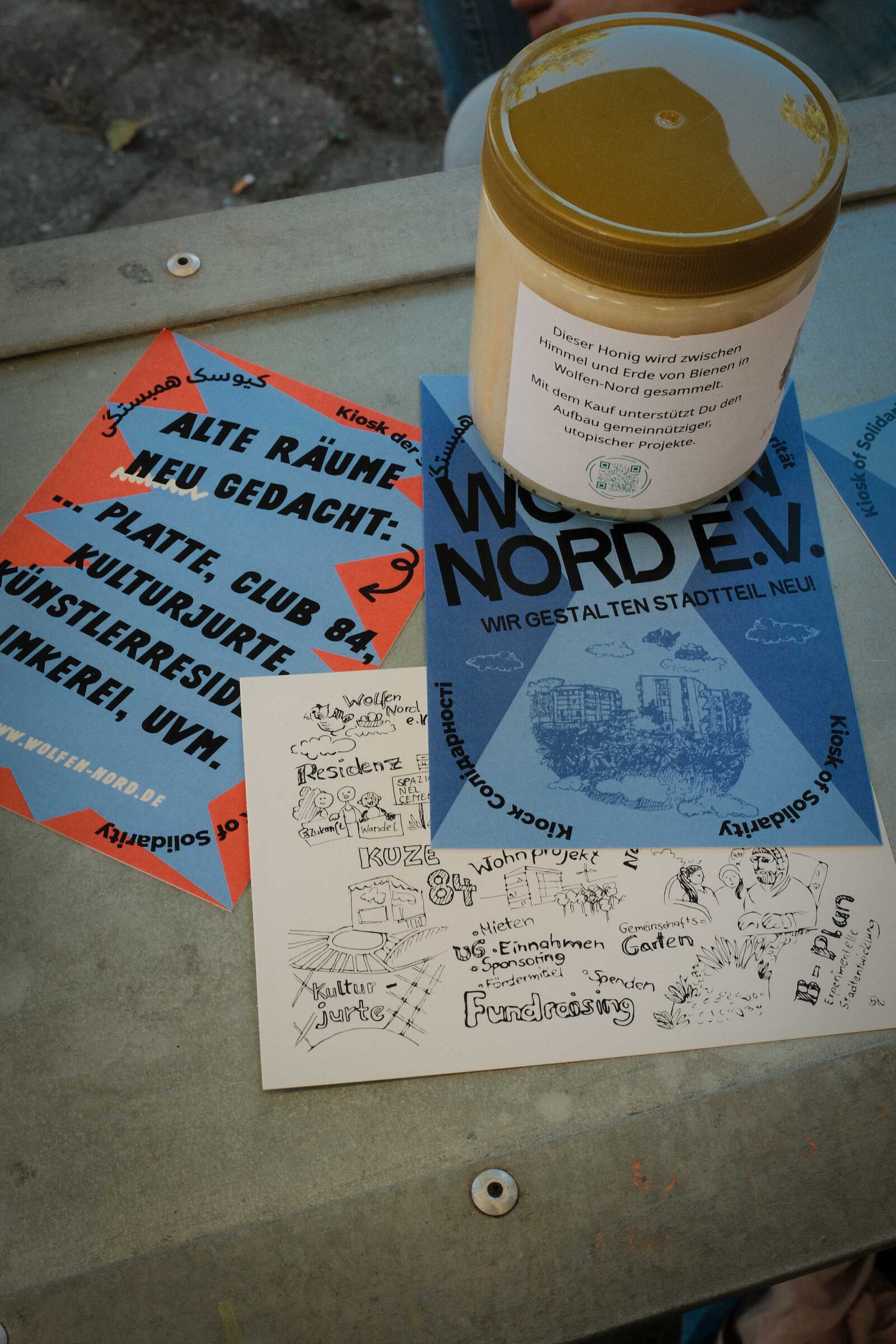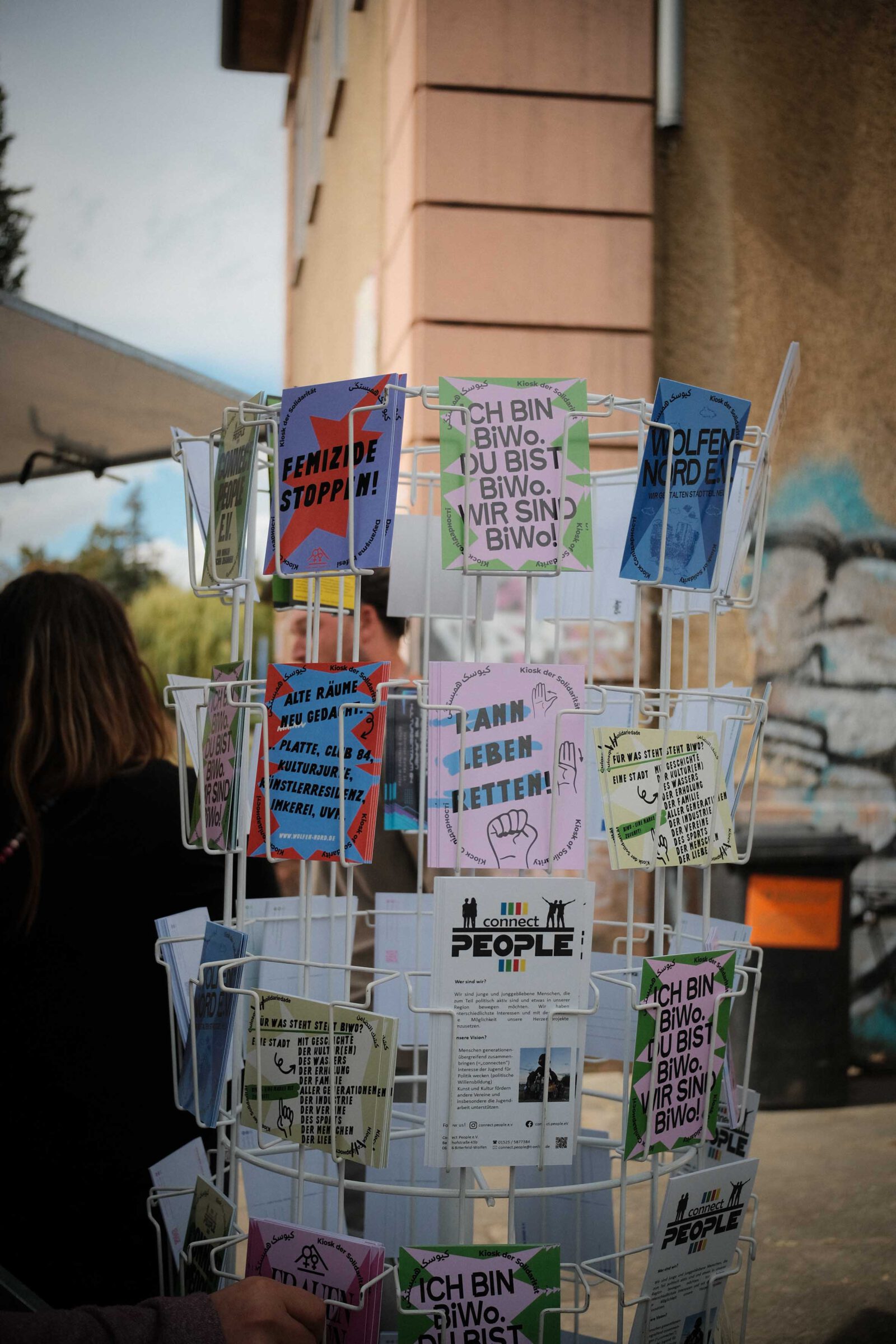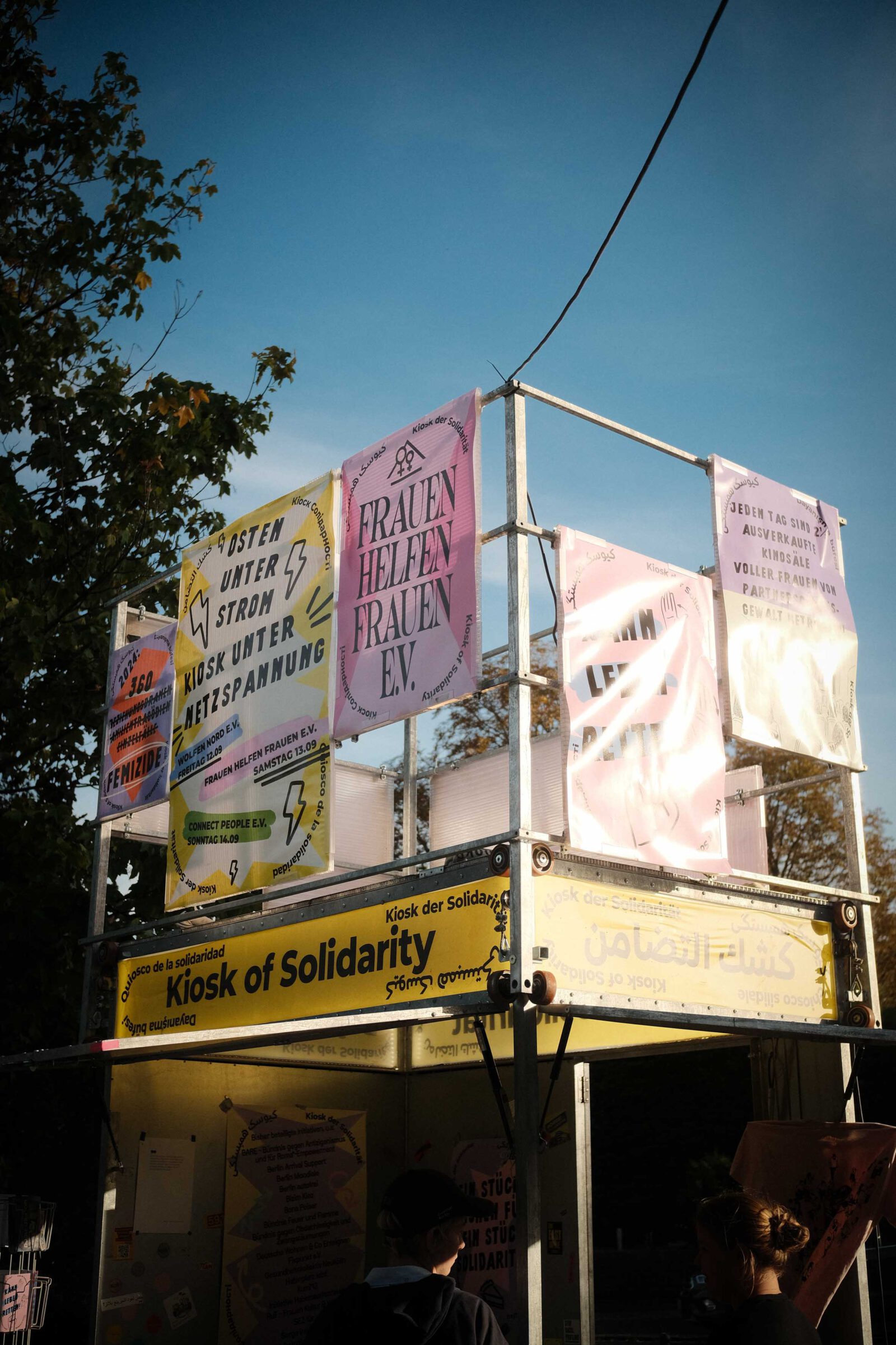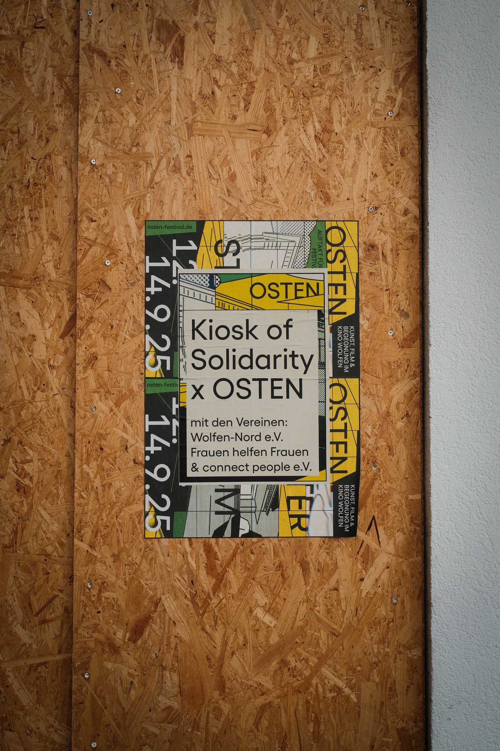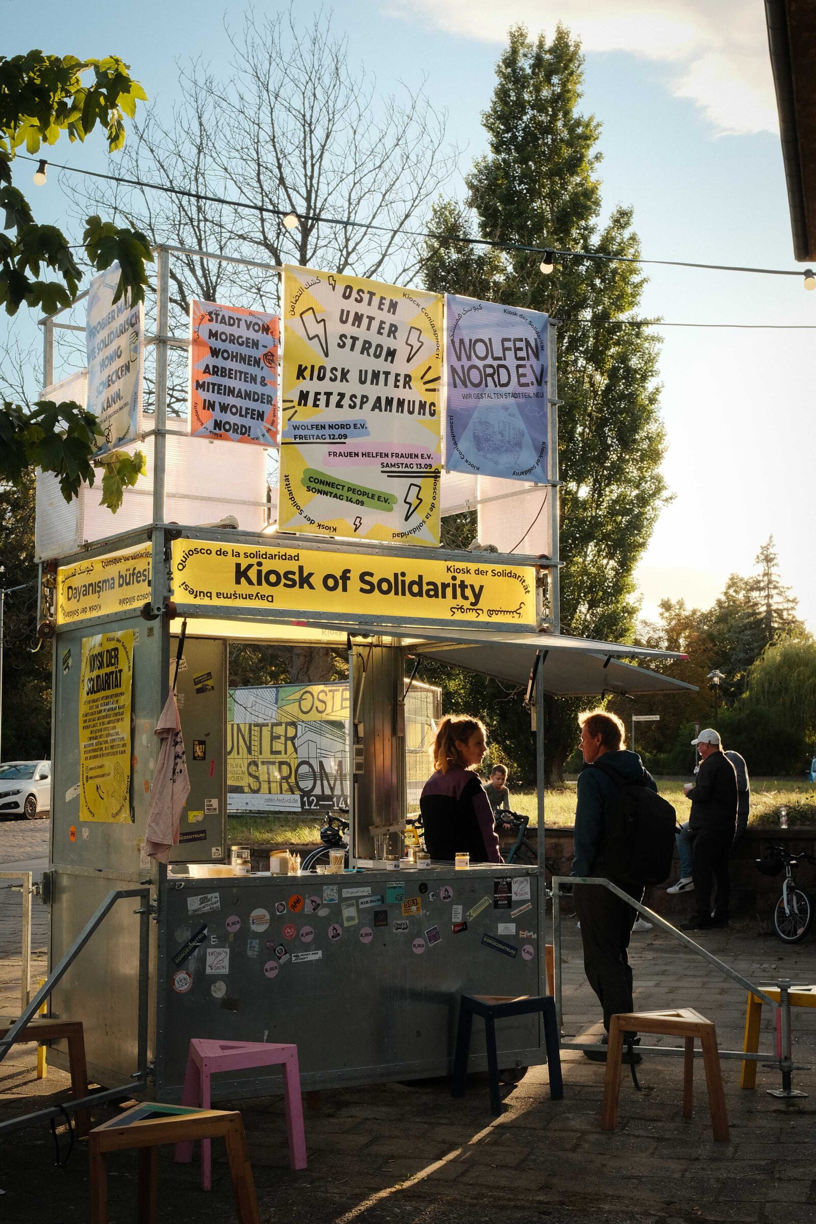 Im Vorfeld von OSTEN UNTER STROM arbeitete das Team des Kiosk of Solidarity mit den lokalen Vereinen Frauen helfen Frauen e.V. , Connect People e. V. und Wolfen Nord e.V. und gestalteten gemeinsam Plakate mit ihren Anliegen und kleine Aktionen. Jeden Tag stand der Kiosk einem anderen der drei Vereinen zur Verfügung.
