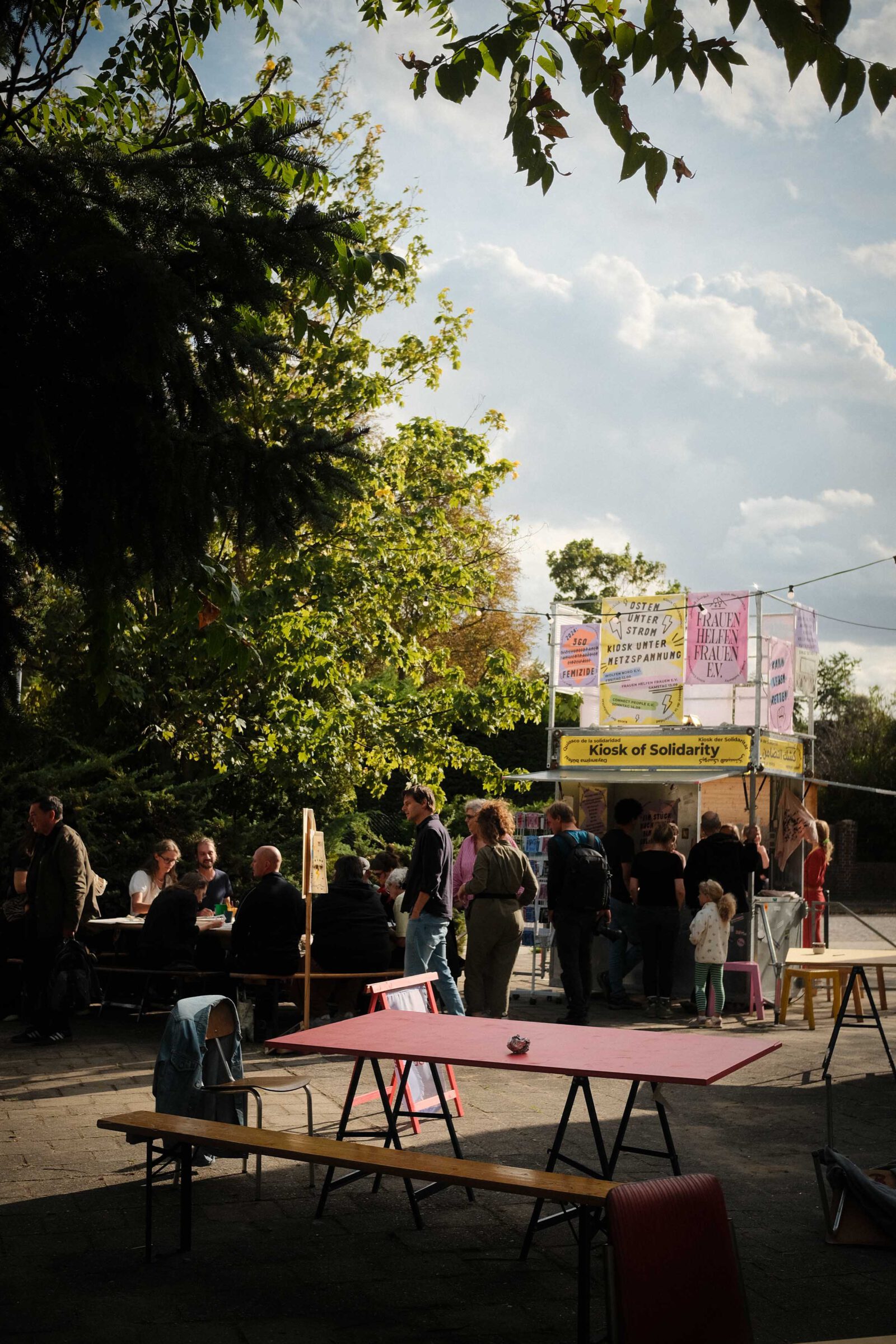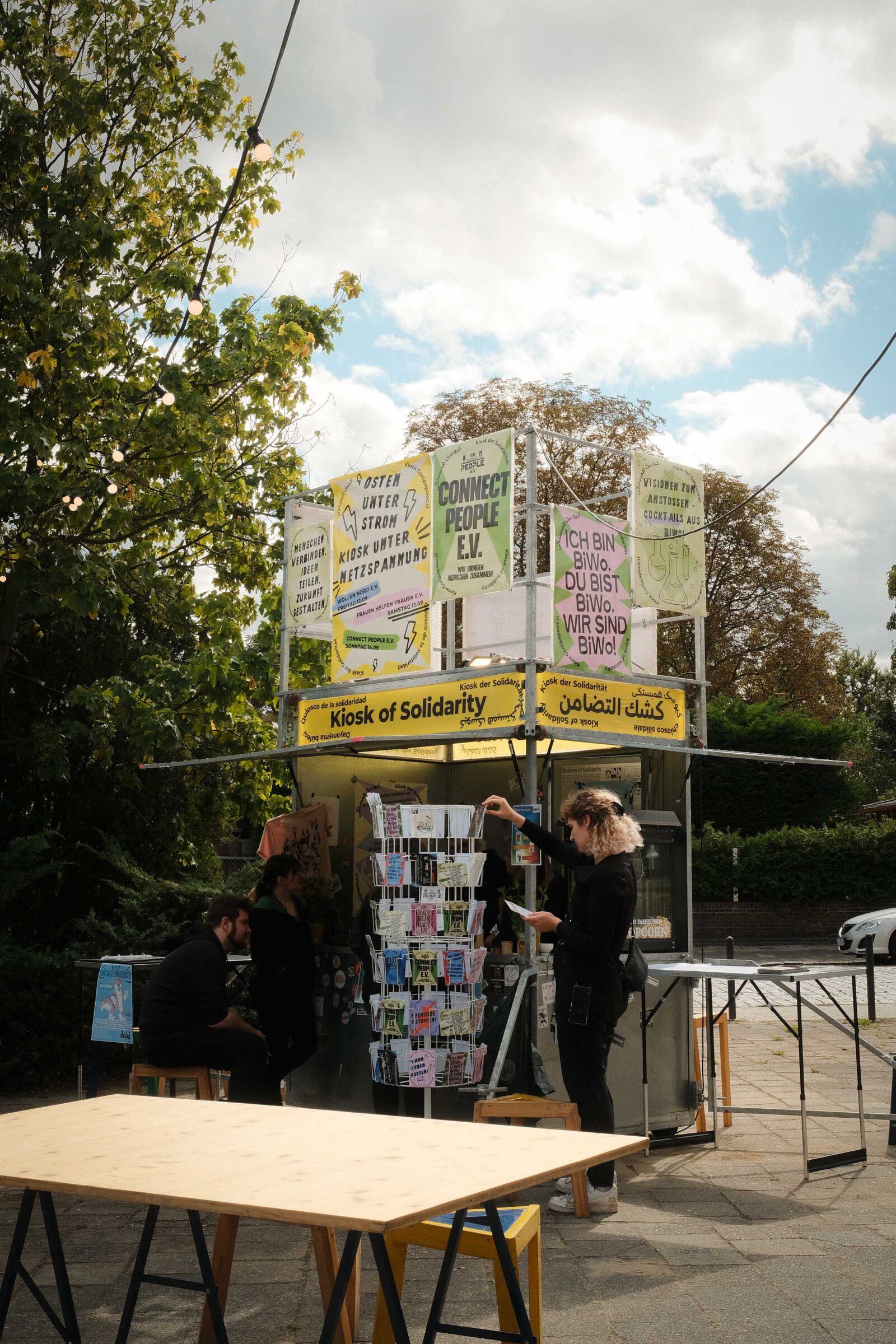 Der Kiosk der Solidarität ist ein urbanes Praxis-Format, das in die umkämpften gesellschaftlichen Felder Arbeit, Gesundheit und Wohnen in Berlin interveniert. Über 25 solidarische Berliner Initiativen und Projekte haben den Kiosk seit Juni 2023 an unterschiedlichen Orten Berlins jeweils für einige Tage genutzt. In vielfältigen Formaten bringen sie Nachbar*innen, Mitstreitende und andere Interessierte zusammen und tragen ihre solidarische Praxis temporär in den öffentlichen Stadtraum. Der Kiosk erzeugt für  marginalisierte Gruppen (z.B. migrantische, geflüchtete, queere Communities oder wohnungslose Menschen) Sichtbarkeit und vernetzt diese mit anderen Initiativen. Das Kiosk-Projektteam unterstützt, zusammen mit Studierenden der TU Berlin, die Initiativen bei der Realisierung ihrer Nutzungsideen für den Kiosk: bei der Gestaltung der Poster, der Beantragung der Standgenehmigungen, der Logistik, der Dokumentation und der Finanzierung.