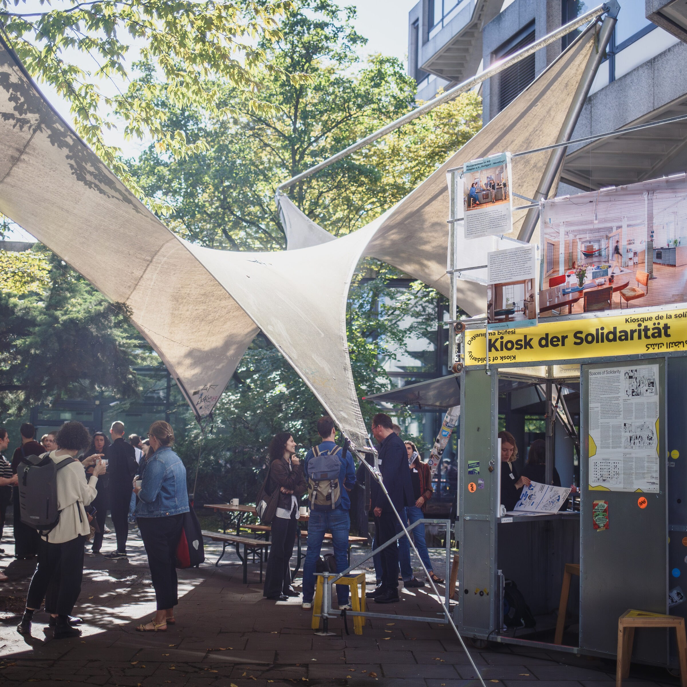 Der Kiosk der Solidarität ist ein urbanes Praxis-Format, das in die umkämpften gesellschaftlichen Felder Arbeit, Gesundheit und Wohnen in Berlin interveniert. Über 25 solidarische Berliner Initiativen und Projekte haben den Kiosk seit Juni 2023 an unterschiedlichen Orten Berlins jeweils für einige Tage genutzt. In vielfältigen Formaten bringen sie Nachbar*innen, Mitstreitende und andere Interessierte zusammen und tragen ihre solidarische Praxis temporär in den öffentlichen Stadtraum. Der Kiosk erzeugt für  marginalisierte Gruppen (z.B. migrantische, geflüchtete, queere Communities oder wohnungslose Menschen) Sichtbarkeit und vernetzt diese mit anderen Initiativen. Das Kiosk-Projektteam unterstützt, zusammen mit Studierenden der TU Berlin, die Initiativen bei der Realisierung ihrer Nutzungsideen für den Kiosk: bei der Gestaltung der Poster, der Beantragung der Standgenehmigungen, der Logistik, der Dokumentation und der Finanzierung.